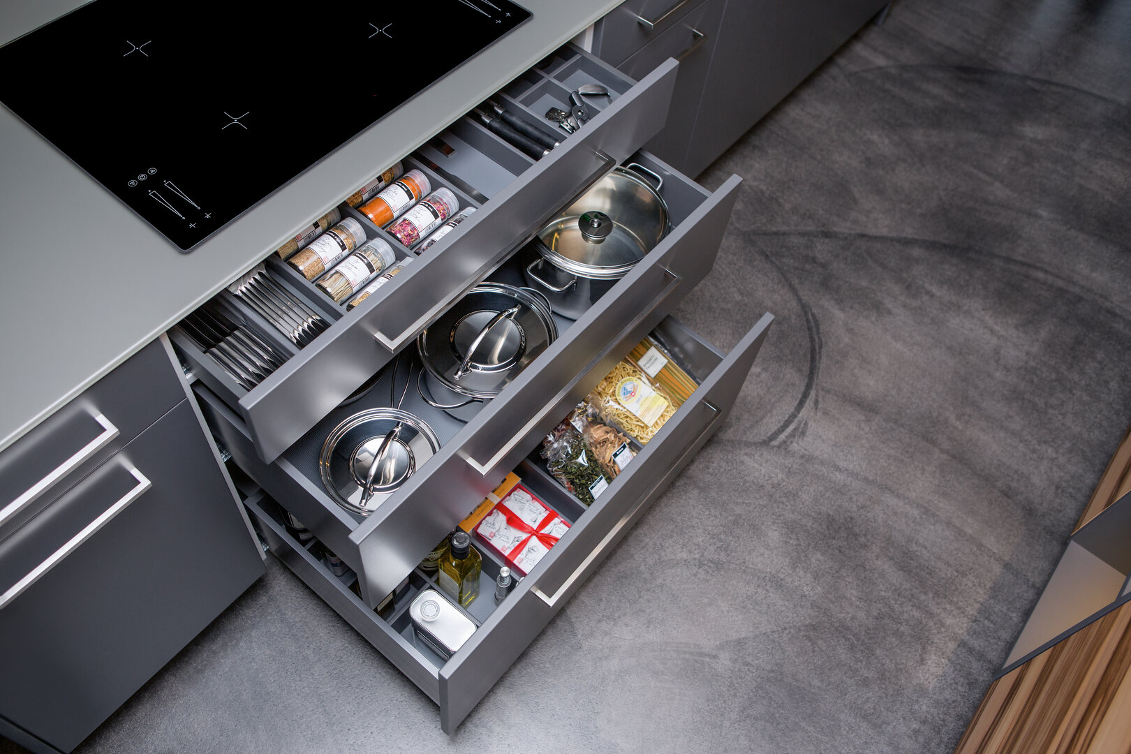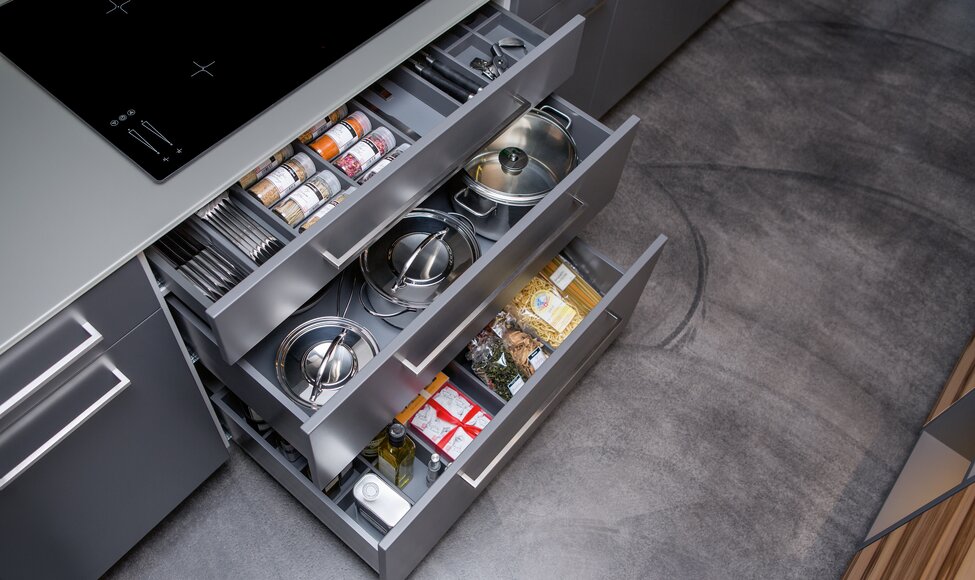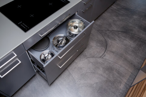 Unter dem Herd auf drei Etagen – alles, was es zum Kochen braucht, schnell zur Hand.